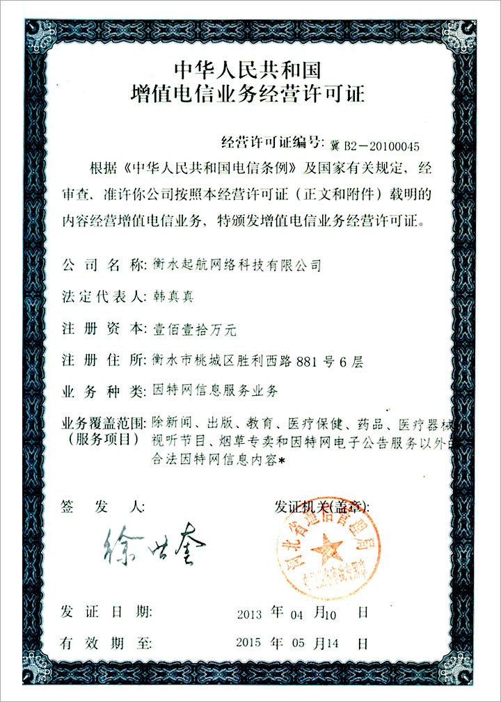 衡水起航網(wǎng)絡(luò)科技有限公司已于近日順利獲得省通信管理局頒發(fā)的增值電信業(yè)務(wù)經(jīng)營(yíng)許可證,證書號(hào)碼:冀B2-20100045 。
