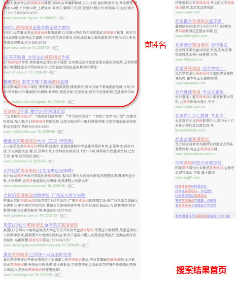 有調(diào)查數(shù)據(jù)顯示,當(dāng)用戶搜索之后,不用上下移動(dòng)瀏覽窗口時(shí)就能看到的搜索結(jié)果被點(diǎn)擊的可能性最大。所以,根據(jù)不同的顯示器分辨率,前4名是最佳的搶占位置。