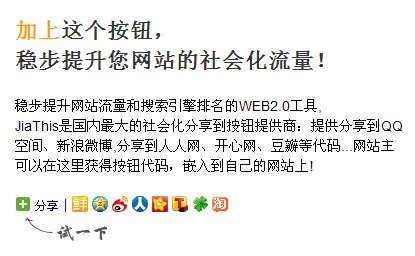 JiaThis是國(guó)內(nèi)最大的社會(huì)化分享到按鈕提供商:提供分享到QQ空間、新浪微博,分享到人人網(wǎng)、開心網(wǎng)、豆瓣等代碼...網(wǎng)站主可以在這里獲得按鈕代碼,嵌入到自己的網(wǎng)站上!