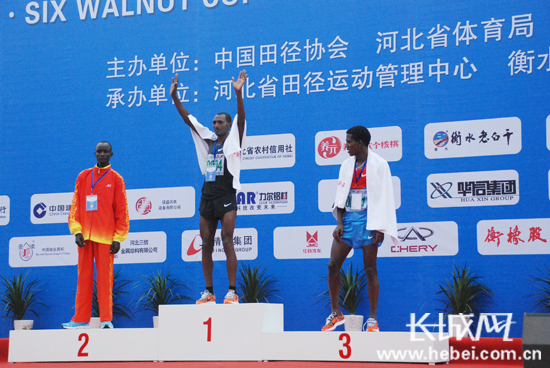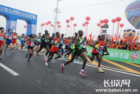 長城網(wǎng)衡水9月22日電(王永宏 扈煒)今日8時(shí)02分,2012衡水湖國際馬拉松賽鳴槍開跑,在衡水湖國際馬拉松賽廣場,來自世界26個(gè)國家和地區(qū)的參賽選手及馬拉松愛好者沖出起點(diǎn)。經(jīng)過激烈角逐,來自埃塞俄比亞選手雷格塞·海路·梅克楠以2小時(shí)8分7秒、黛米西·埃塔勒瑪胡·基達(dá)妮以2小時(shí)28分3秒的成績包攬全程馬拉松賽男女組冠軍。